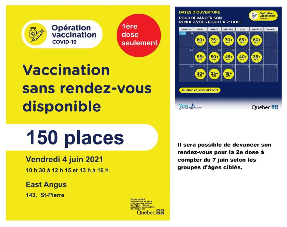 Aujourd’hui vendredi 4 juin – Clinique de vaccination sans rendez-vous seulement pour la 1ère dose Agrandir l'image Important – Clinique de vaccination sans rendez-vous seulement pour la 1ère dose Aujourd’hui – Vendredi 4 juin de 10 h 30 à 12 h 15 et de 13 h à 16 h Il sera possible de devancer son rendez-vous pour la 2e dose à compter du 7 juin selon les groupes d’âges ciblés. East Angus2021-06-04T06:45:16-04:004 juin 2021|Actualités| Partager sur les réseaux FacebookTwitterCourriel