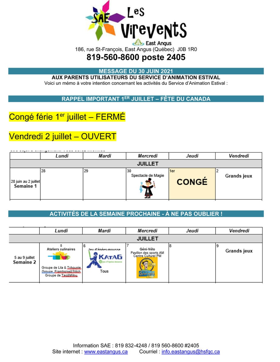Le service d’animation estival (SAE Les Virevents) sera fermé demain jeudi 1er juillet, mais ouvert le vendredi 2 juillet.