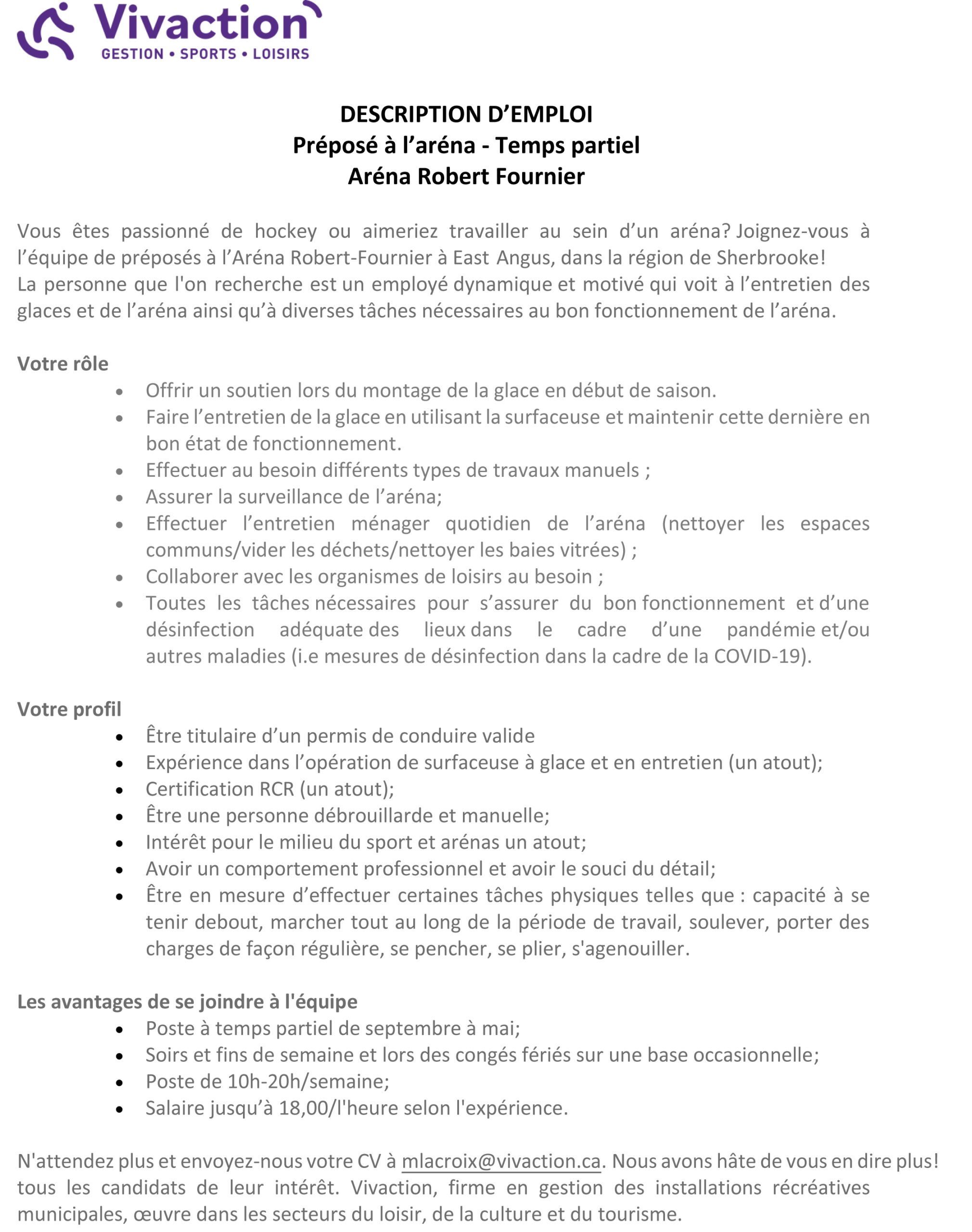 Offre d’emploi – Préposé à temps partiel à l’Aréna Robert-Fournier