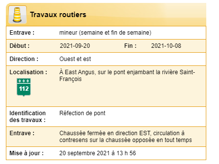Pour information, voici un avis d’entraves concernant la route 112 à East Angus.