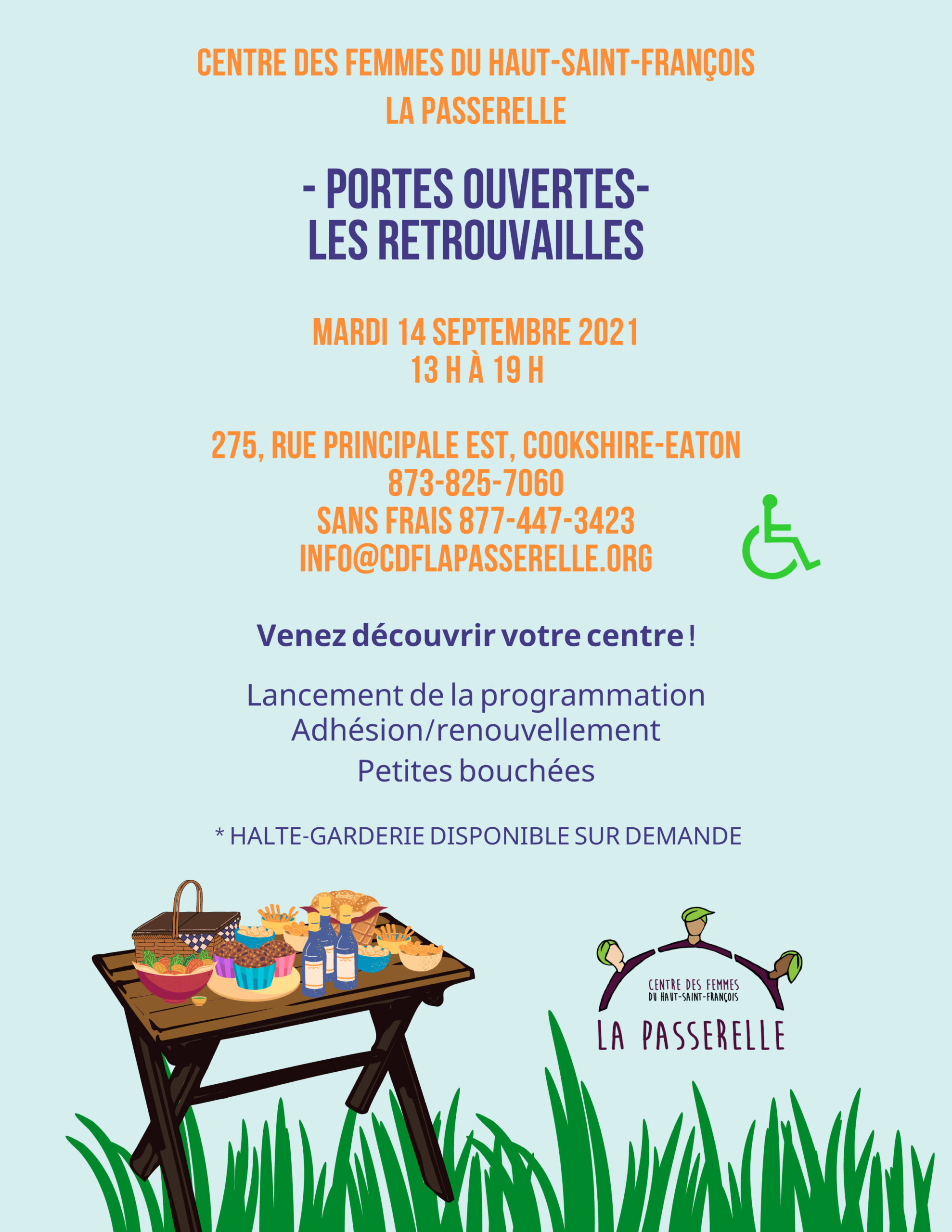 Portes ouvertes du Centre des femmes du Haut-Saint-François La Passerelle Agrandir l'image Portes ouvertes du Centre des femmes du Haut-Saint-François La Passerelle Mardi 14 septembre 2021 de 13 h à 19 h 275, rue Principale Est, Cookshire-Eaton 873 825-7060 East Angus2021-09-08T18:16:06-04:008 septembre 2021|Actualités| Partager sur les réseaux FacebookTwitterCourriel