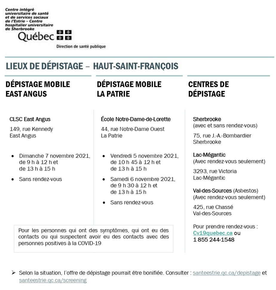 La santé publique organise du dépistage mobile sans rendez-vous à La Patrie et East Angus :