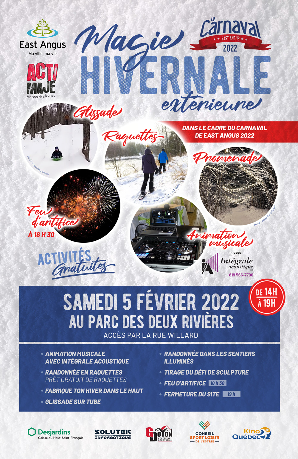 La Maison des jeunes Actimaje et la Ville de East Angus vous invitent au Carnaval d’hiver 2022 ce samedi 5 février 2022 de 14 h à 19 h au Parc des Deux Rivières de East Angus (accès par la rue Willard).