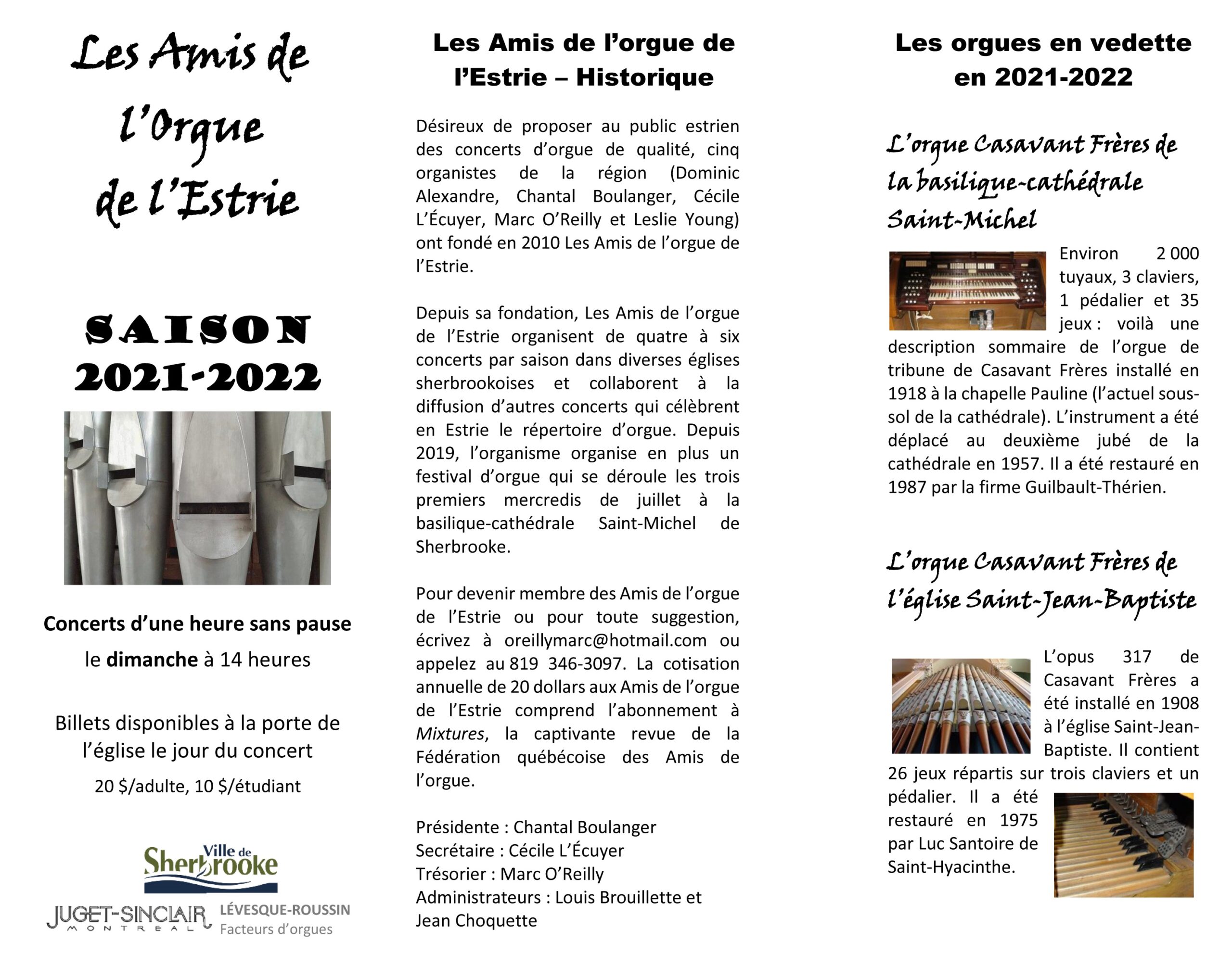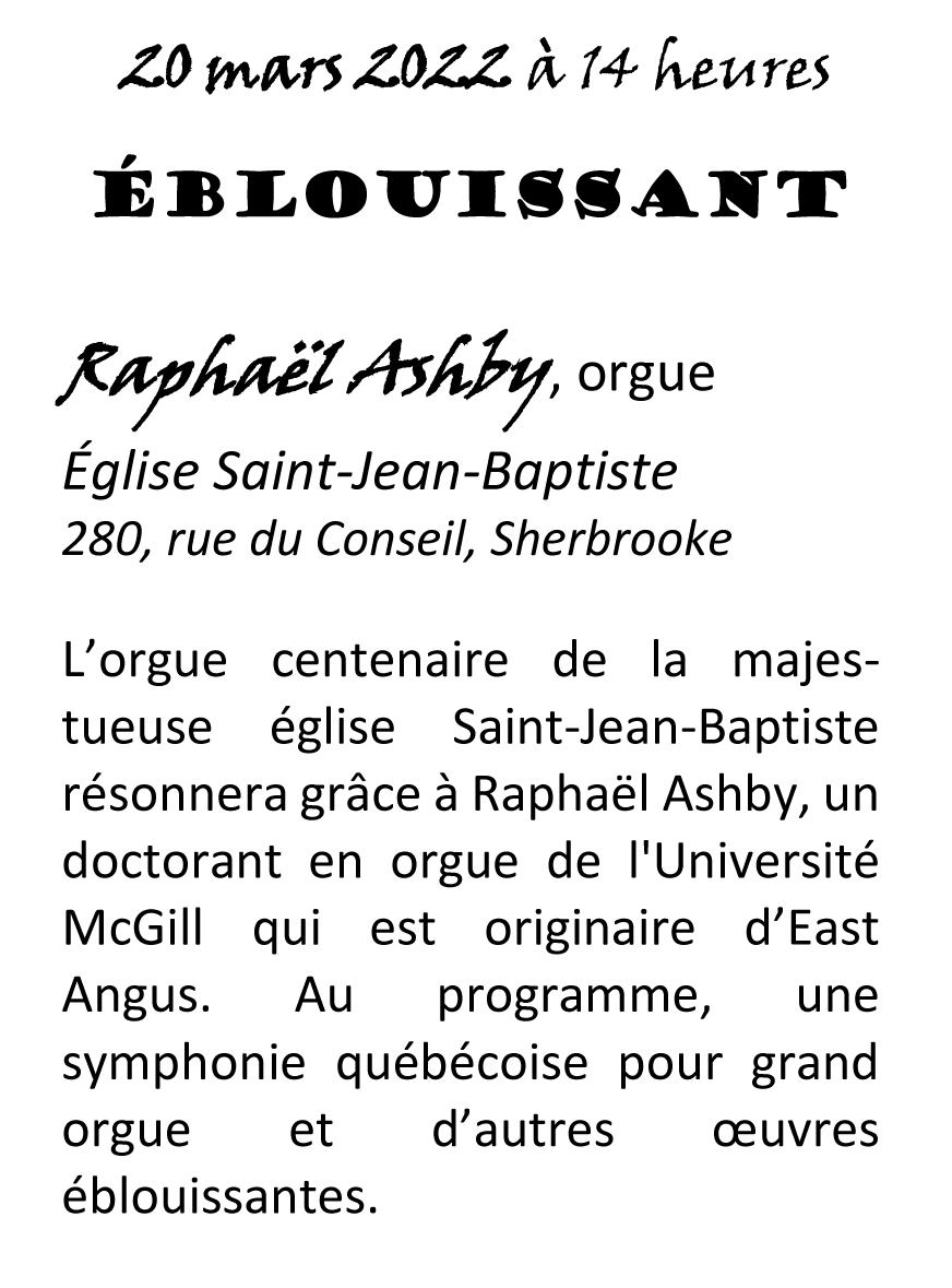 280, rue du Conseil, Sherbrooke L’orgue centenaire de la majes-tueuse église Saint-Jean-Baptiste résonnera grâce à Raphaël Ashby, un doctorant en orgue de l’Université McGill qui est originaire d’East Angus. Au programme, une symphonie québécoise pour grand orgue et d’autres œuvres éblouissantes.