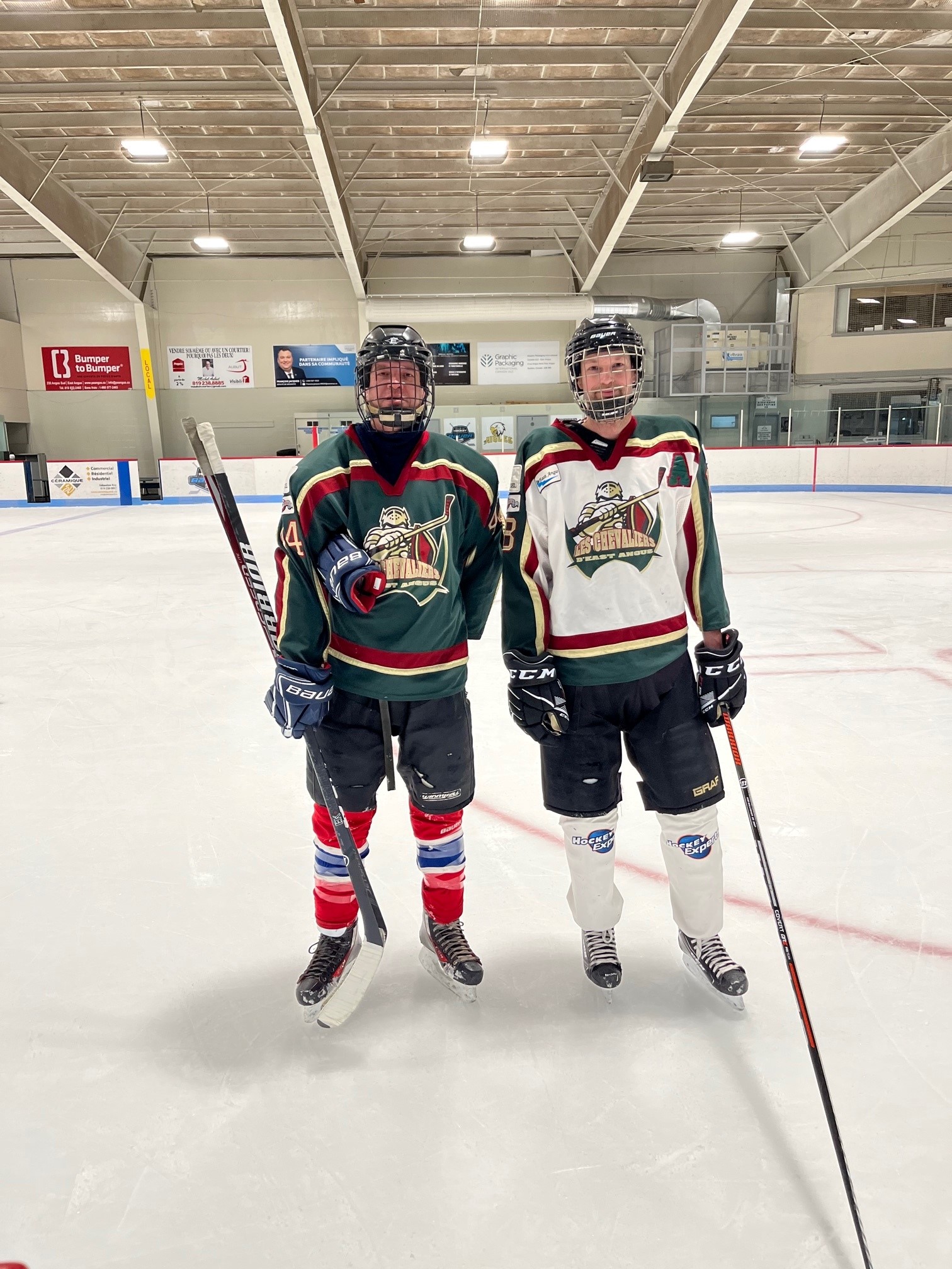 Sur la photo, nous apercevons Ghislain Lambert et Donald Gagnon. Trois anciens membres des Chevaliers de East Angus jouent dans cette ligue du mercredi soir : Patrick Champoux, Charles Phaneuf et David Auger.