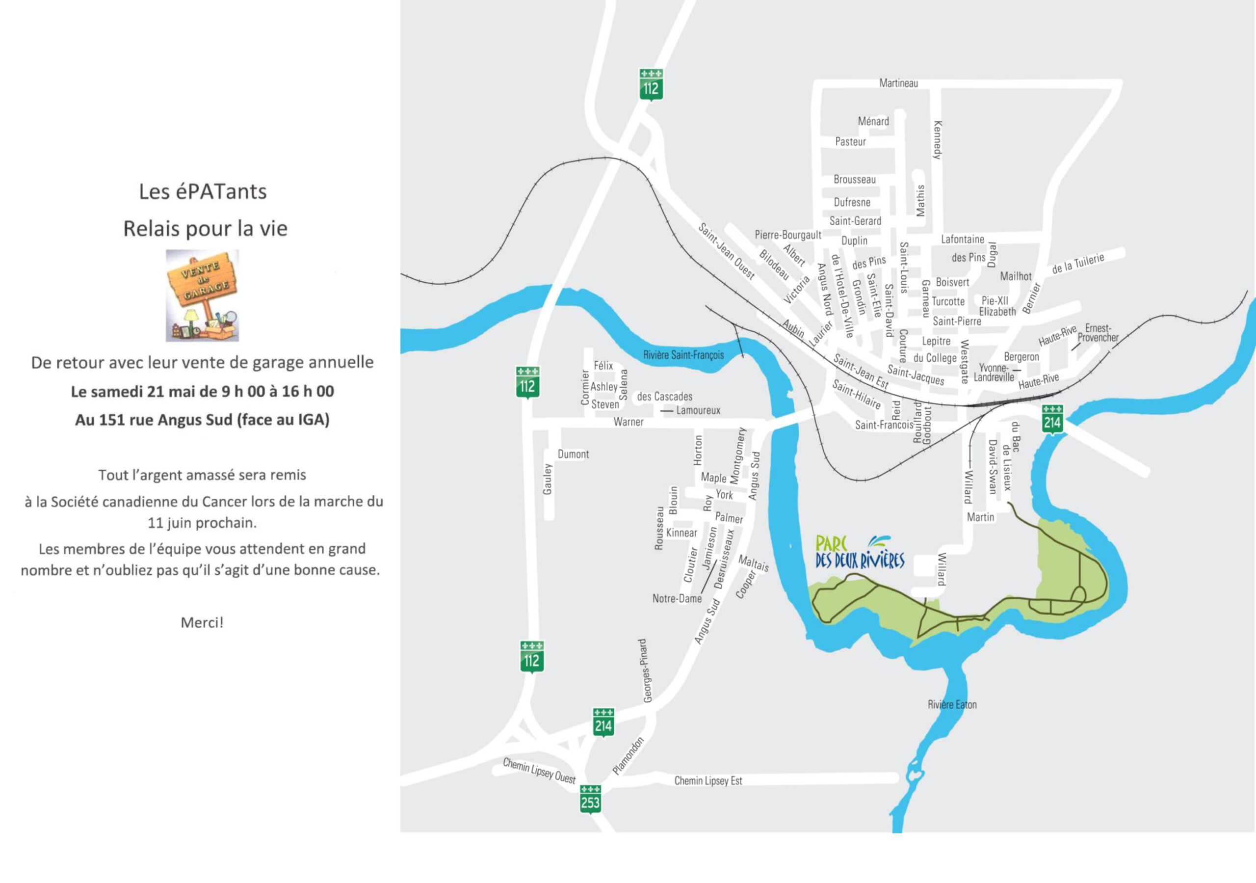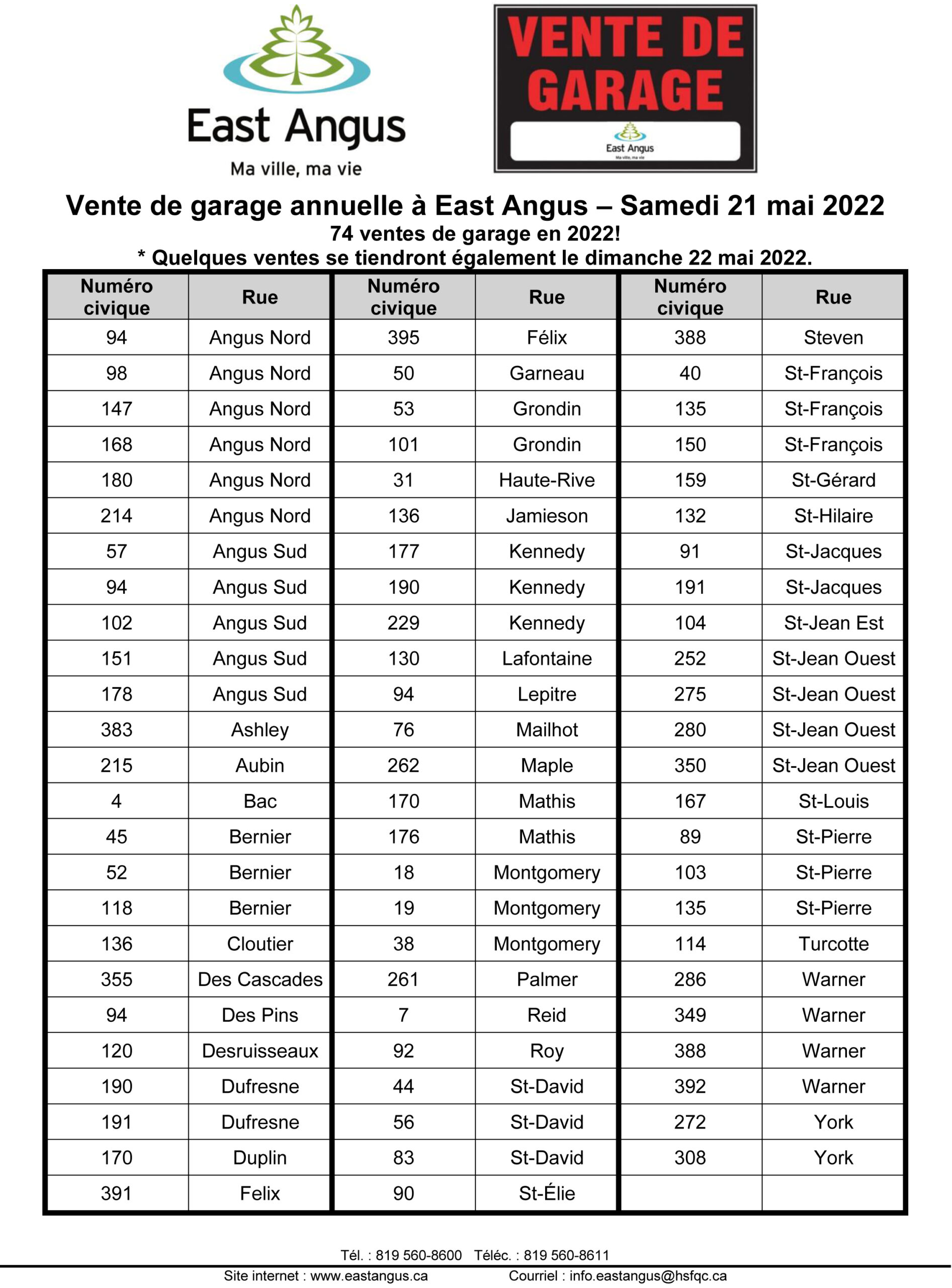 Liste pour impression et également disponible au IGA et dans les dépanneurs angussiens : https://eastangus.ca/wp-content/uploads/2022/05/Ventes-de-garage-2022.pdf