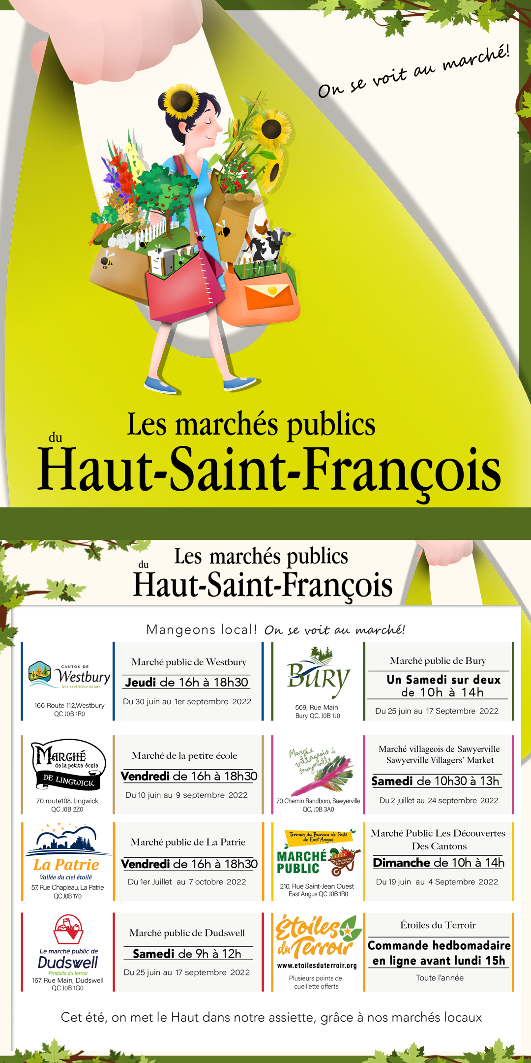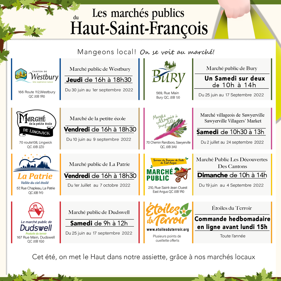 Les Marchés publics du Haut-Saint-François Agrandir l'image Cet été, on met le Haut dans notre assiette, grâce à nos marchés locaux. On se voit au marché! East Angus2022-06-27T11:56:09-04:0027 juin 2022|Actualités| Partager sur les réseaux FacebookTwitterCourriel