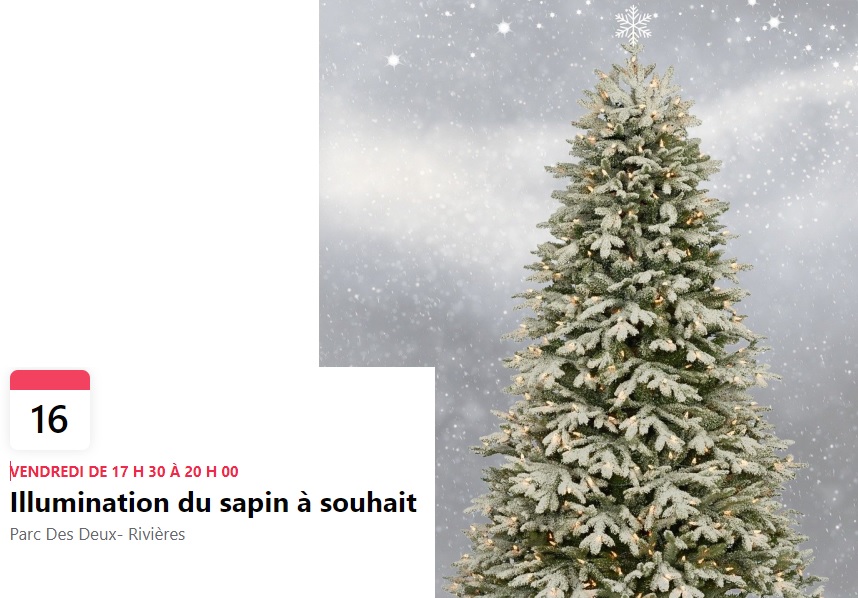 L’illumination du sapin à souhait sera effectuée au même moment que l’illumination d’une partie du Parc des Deux Rivières pour la saison hivernale.