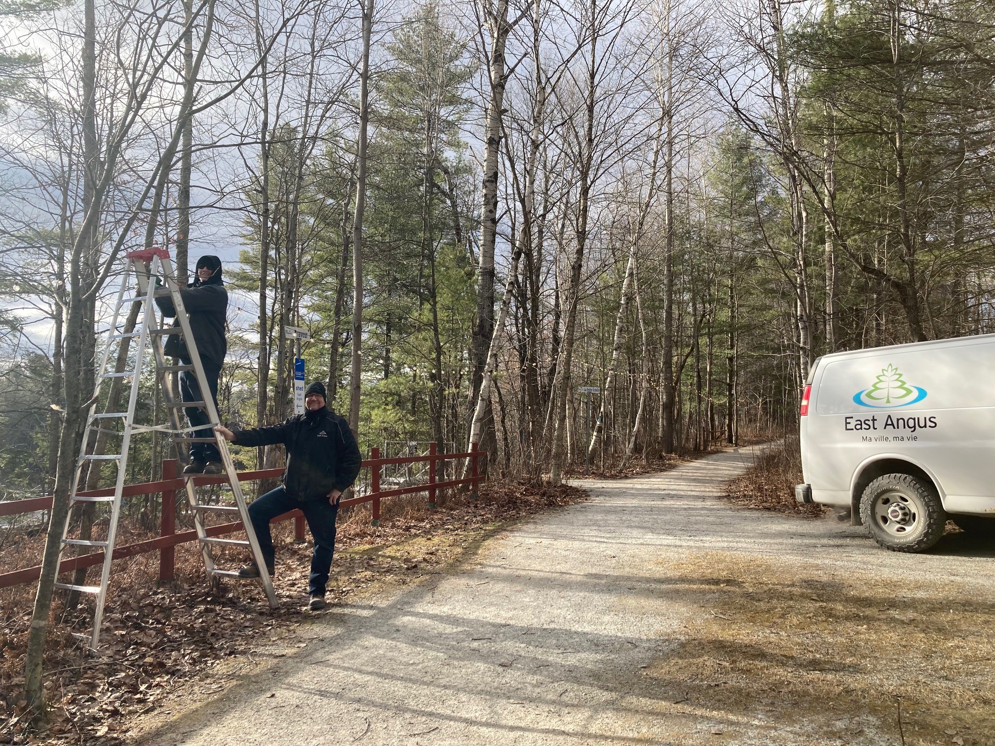 Nos collègues André Aubin et Miguel Fortin ont débuté le travail d’illumination d’une partie du Parc des Deux Rivières afin d’être prêt pour ce vendredi 16 décembre.