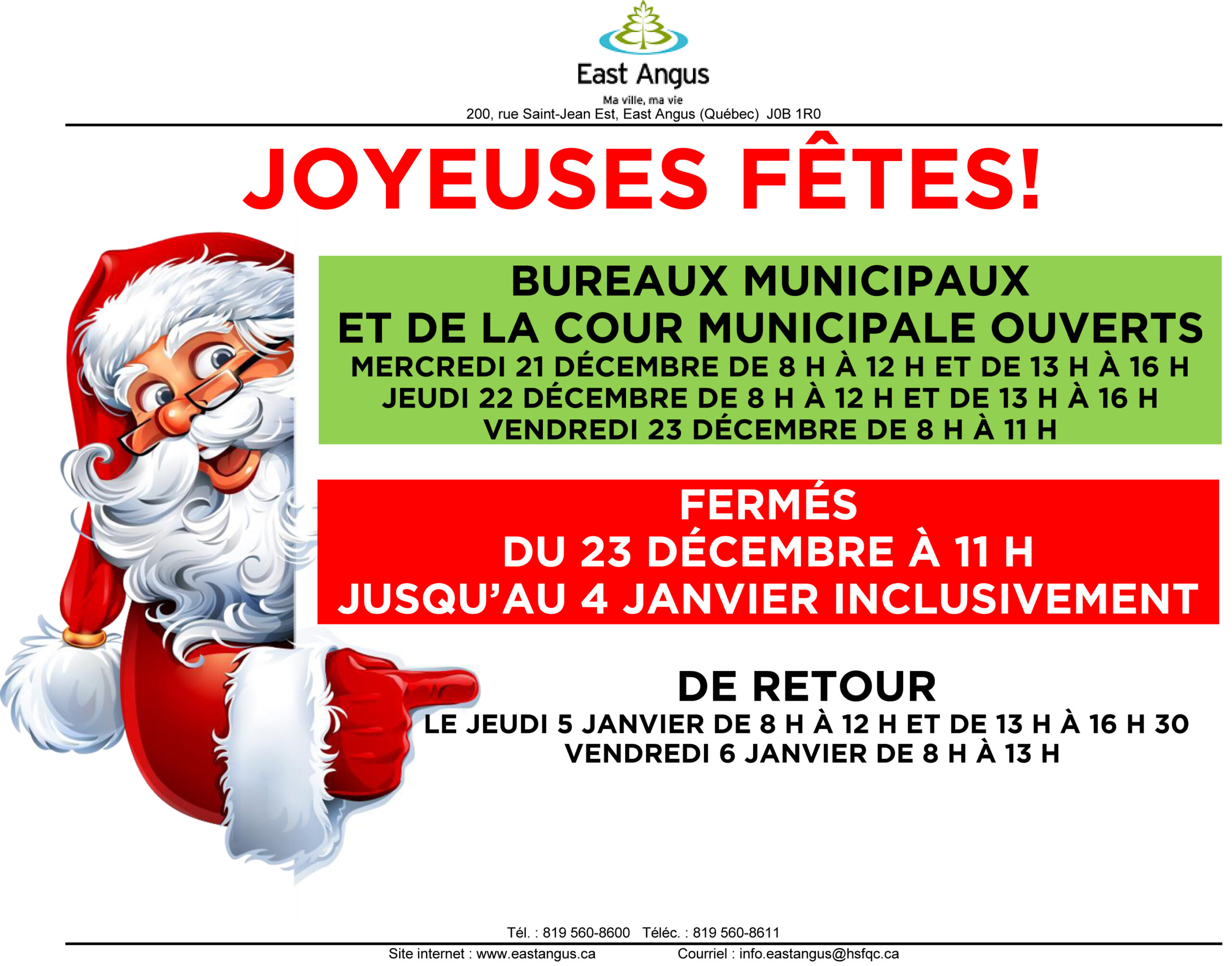 Joyeuses fêtes! Horaire des bureaux municipaux et de la cour municipale Agrandir l'image Horaire des bureaux municipaux et de la cour municipale du 21 décembre 2022 au 6 janvier 2023 Joyeuses fêtes! East Angus2022-12-21T19:51:21-05:0021 décembre 2022|Actualités| Partager sur les réseaux FacebookTwitterCourriel