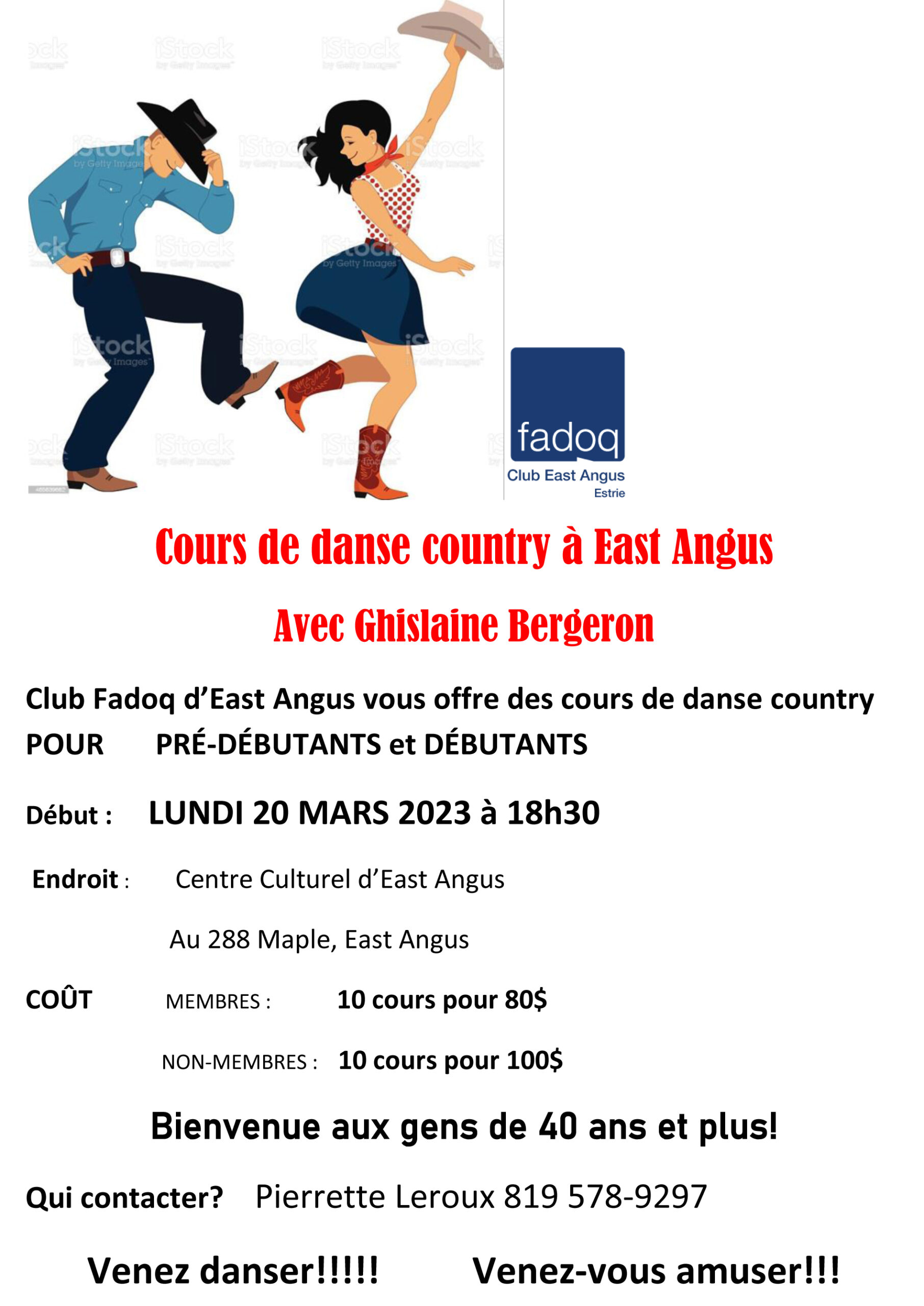 Cours de danse country avec Mme Ghislaine Bergeron au Centre culturel dès le 20 mars.