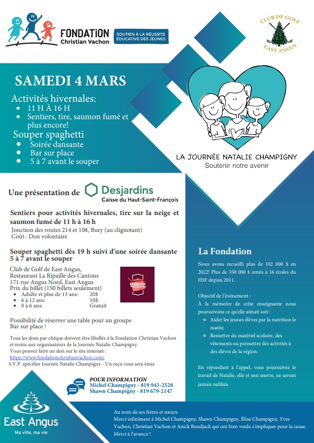 Des activités gratuites aujourd’hui samedi 4 mars 2023 à l’Aréna Robert-Fournier, au Club de golf de East Angus, au Parc des Deux Rivières et dans le cadre des activités de la Journée Natalie Champigny.