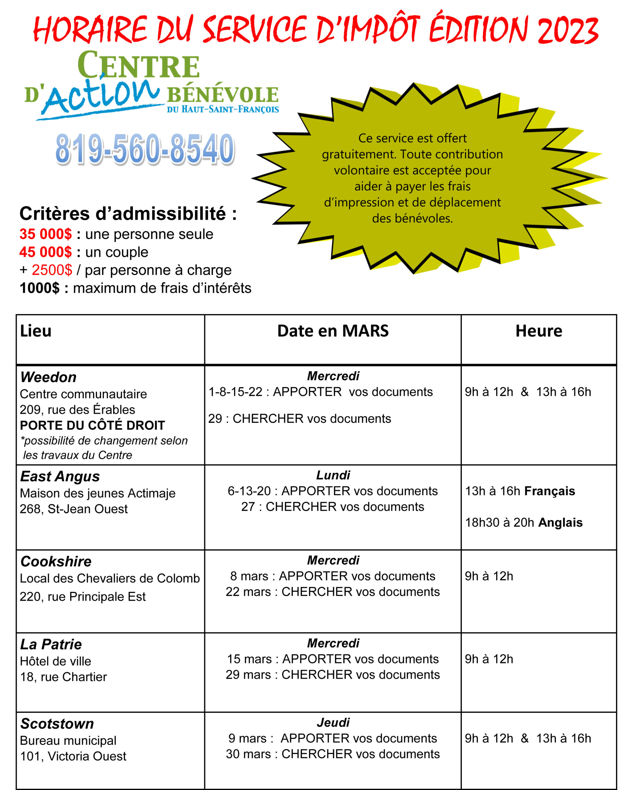 Horaire du service d’impôt – Édition 2023 Agrandir l'image East Angus2023-03-07T08:31:55-05:006 mars 2023|Actualités| Partager sur les réseaux FacebookTwitterCourriel