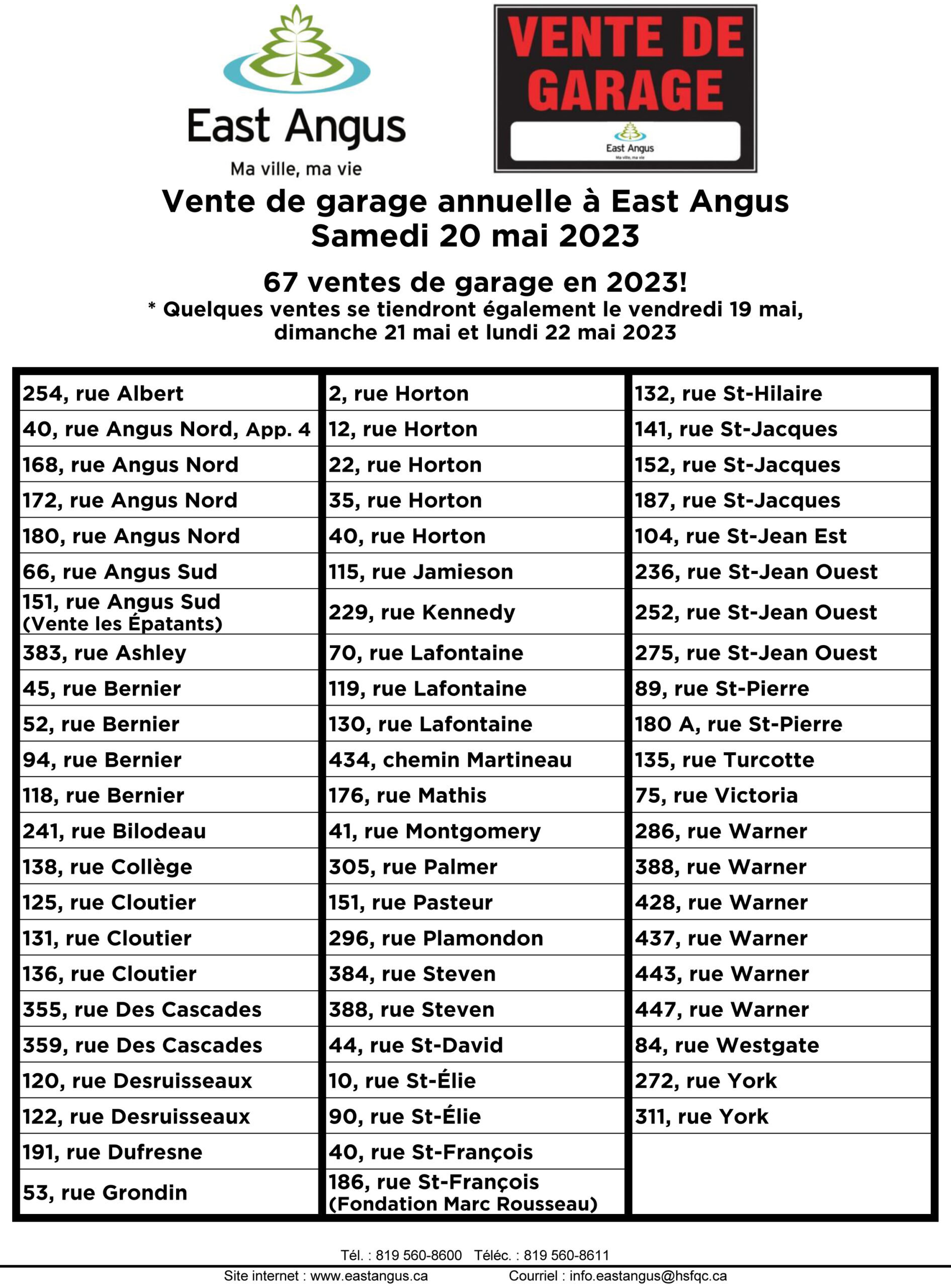 La liste complète des 67 ventes de garage annuelles sur le territoire de la Ville de East Angus.
