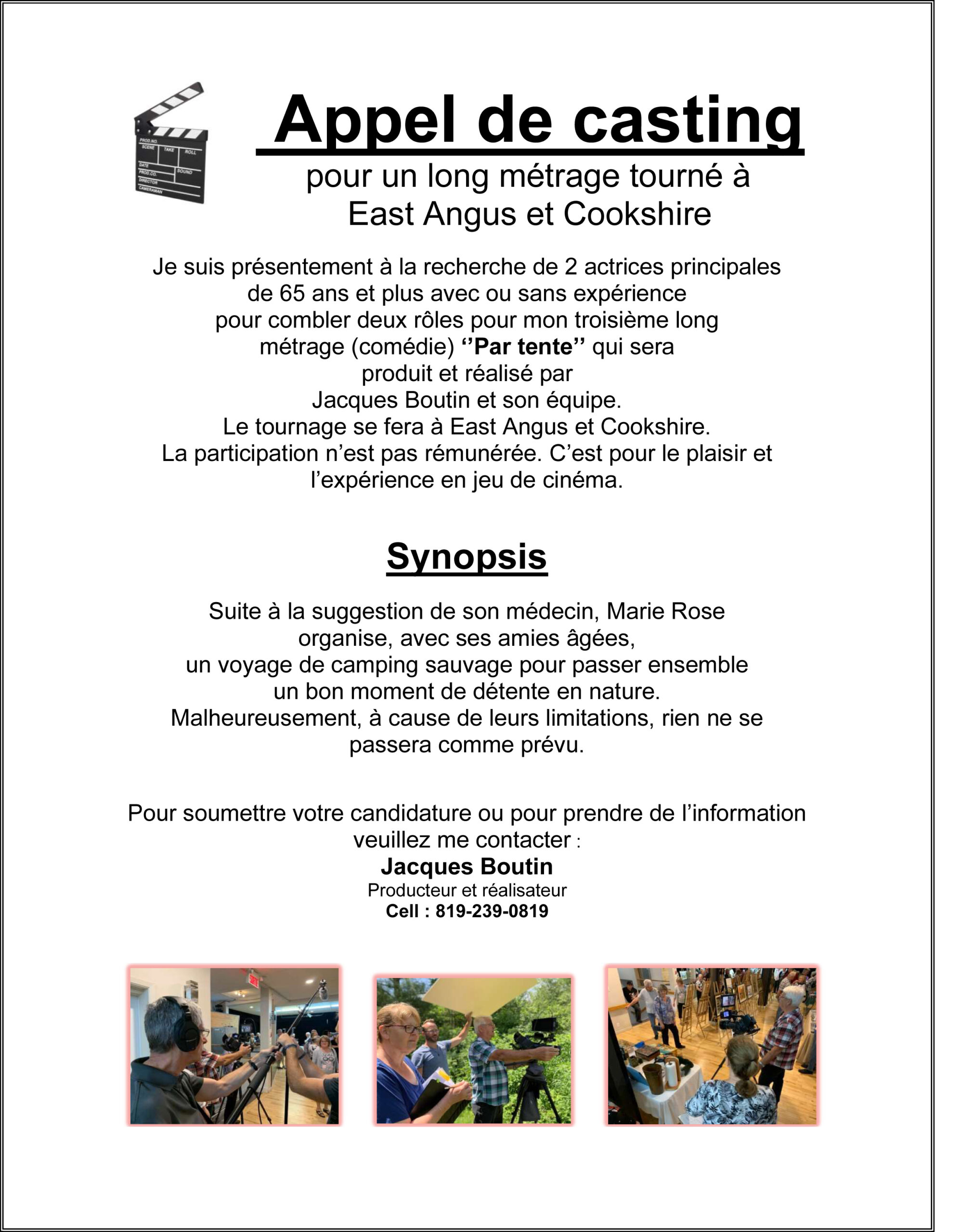 2 actrices principales de 65 ans et plus avec ou sans expérience recherchées pour combler deux rôles pour le 3e long métrage (comédie) du film Par tente qui sera produit et réalisé par Jacques Boutin et son équipe. Le tournage s’effectuera à Cookshire-Eaton et East Angus.