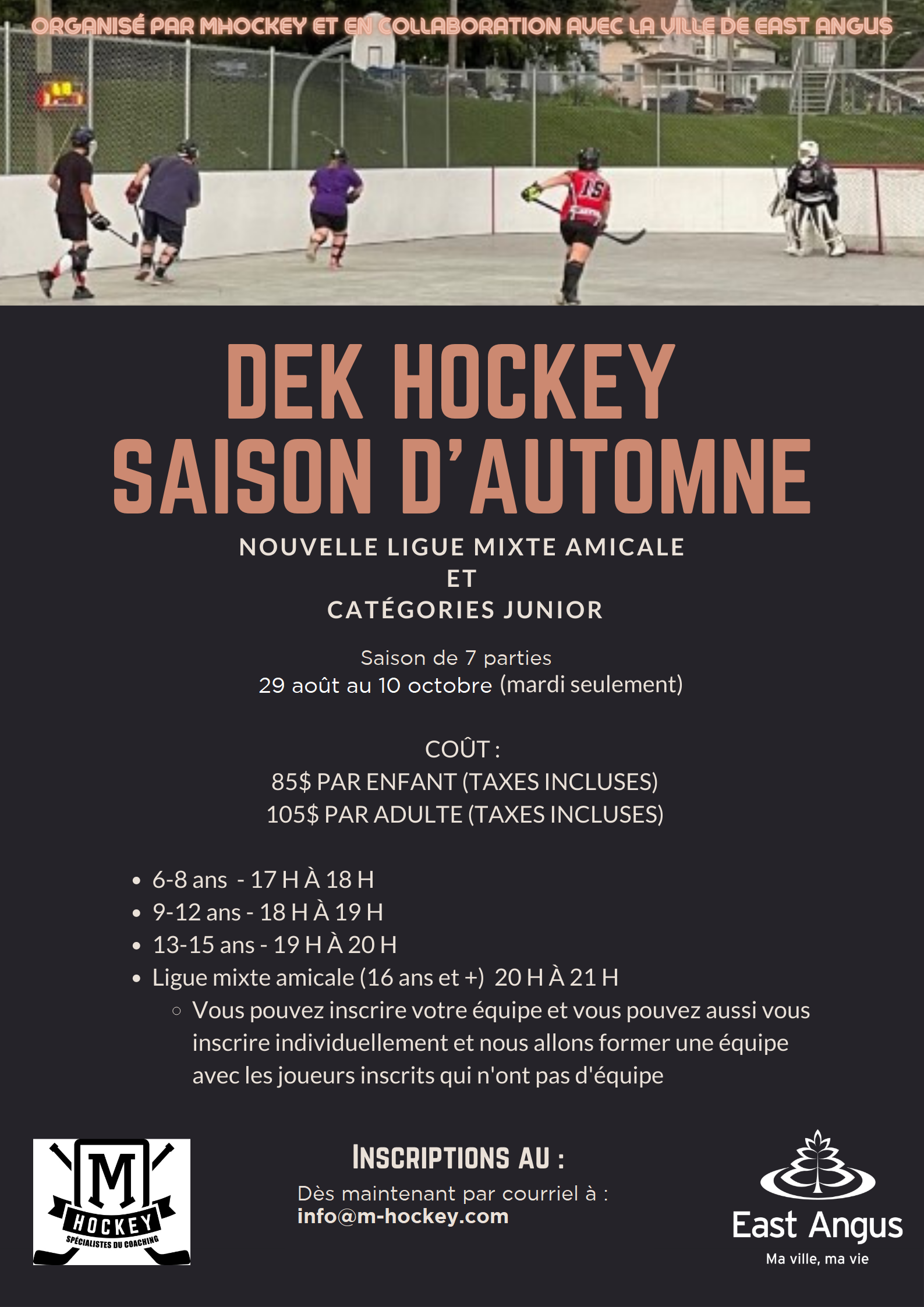 Hockey balle – Saison automne 2023 : Inscriptions dès maintenant! Agrandir l'image Hockey balle – Saison automne 2023 Du 29 août au 10 octobre 2023 Inscription dès maintenant par courriel : info@m-hockey.com East Angus2023-08-16T12:05:32-04:006 août 2023|Actualités| Partager sur les réseaux FacebookTwitterCourriel