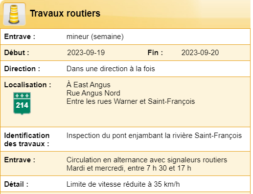 Entrave du Ministère des Transports du 19 au 20 septembre 2023 – Pont Taschereau, East Angus Agrandir l'image East Angus2023-09-18T20:24:22-04:0018 septembre 2023|Actualités| Partager sur les réseaux FacebookTwitterCourriel