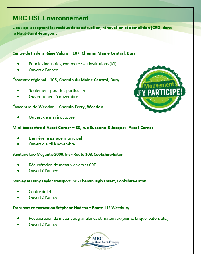 Mouvement j’y participe : Qui accepte les résidus de construction, rénovation et démolition dans le Haut-Saint-François? Agrandir l'image Mouvement j’y participe : Qui accepte les résidus de construction, rénovation et démolition dans le Haut-Saint-François? East Angus2023-09-28T20:57:42-04:0028 septembre 2023|Actualités| Partager sur les réseaux FacebookTwitterCourriel