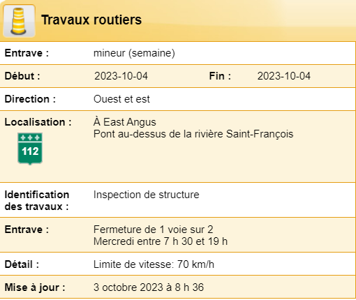Veuillez prendre connaissance de l’avis annonçant des entraves de la route 112 à East Angus.