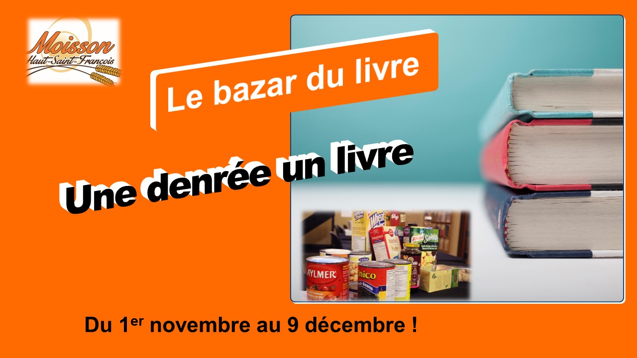 Le bazar du livre de Moisson Haut-Saint-François au Centre culturel de East Angus au 288, rue Maple offre un livre en échange d’une denrée à l’approche de la préparation des paniers de Noël. Venez-nous voir les jeudis de 13 h à 16 h jusqu’au 9 décembre 2023!