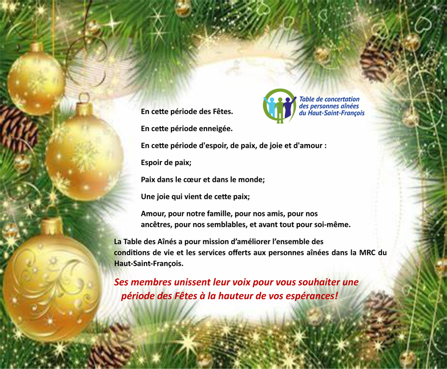 Joyeuses fêtes de la part de la Table de concertation des personnes aînées du Haut-Saint-François!