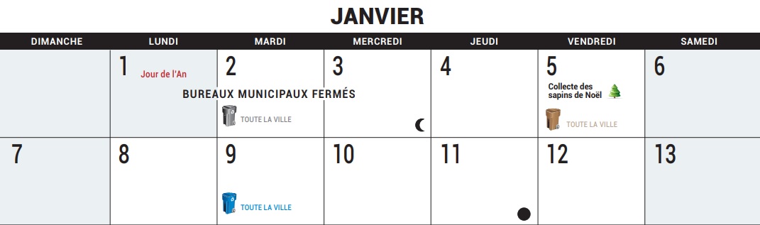 Prenez note des prochaines collectes de recyclage, ordures, compost et la collecte des sapins naturels qui auront lieu au début de l’année 2024.