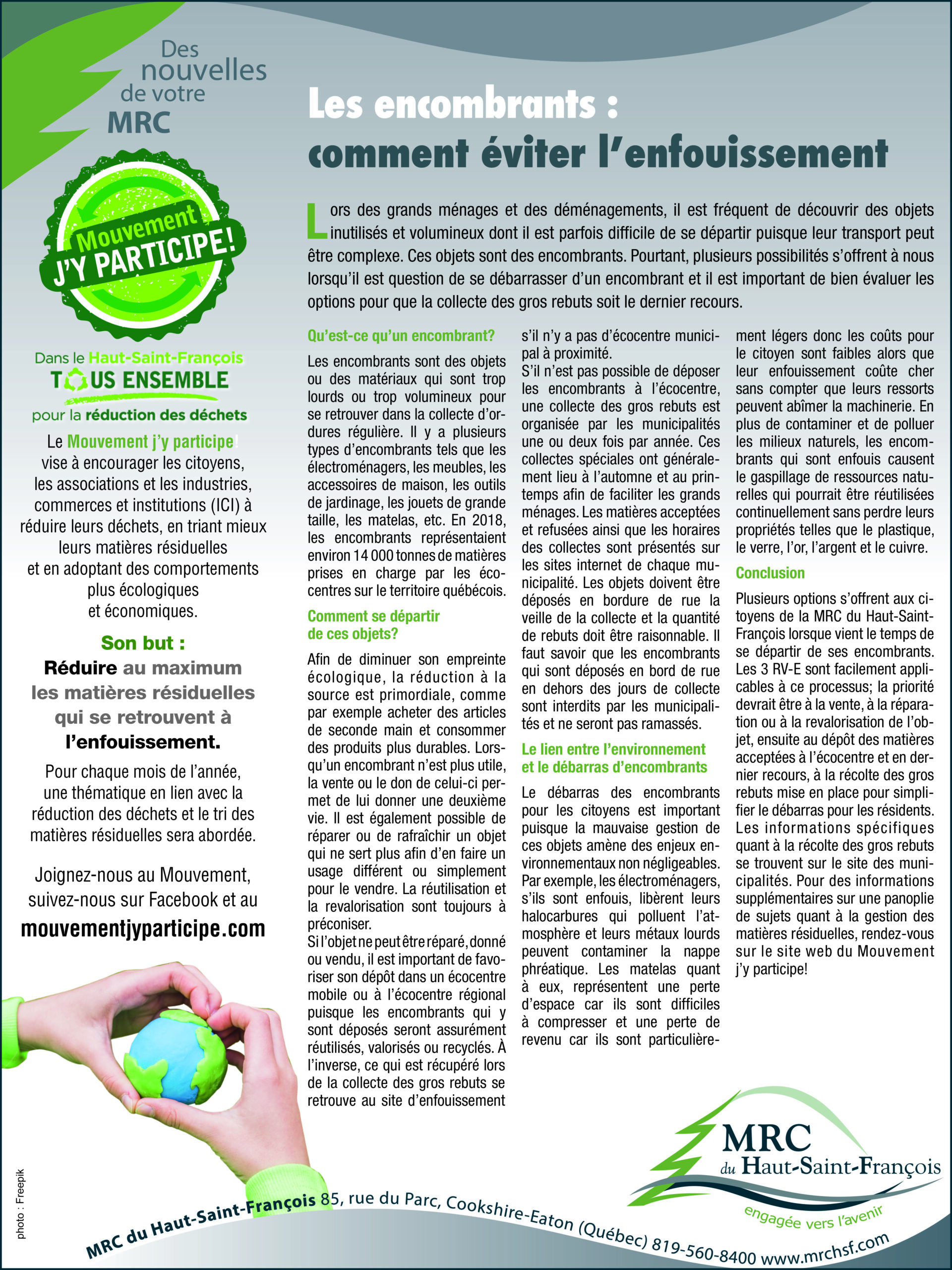 Samedi 31 mai 2025 : Écocentre mobile de 8 h à 12 h au garage municipal (16, rue David-Swan, East Angus). Nous accepterons les éléments suivants durant l’Écocentre mobile: peinture, bois de construction, métal, textiles, résidus verts, styromousse, pneus, électronique (téléviseurs, ordinateurs, etc…), don de compost (3 contenants par adresse et apportez vos pelles et contenants), déchiquetage de documents confidentiels.
