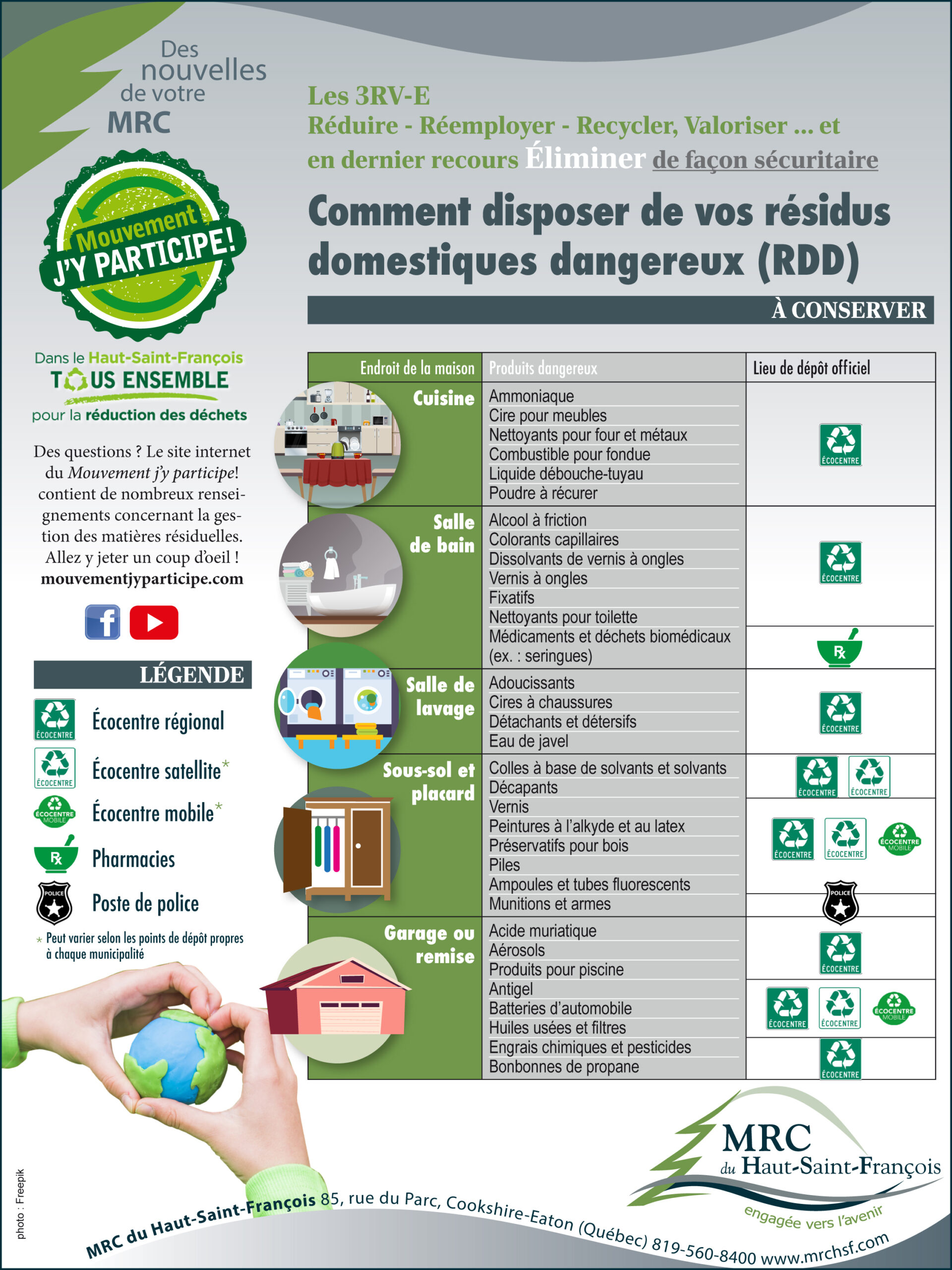 Dans le cadre de la mise en œuvre des plans de gestion des matières résiduelles, plusieurs organisations municipales mettent sur pied, sur une base permanente ou occasionnelle, des collectes de résidus domestiques dangereux (RDD), ce qui permet aux citoyens de disposer de leurs résidus de peinture dans le respect de l’environnement. Il est possible de se départir de vos contenants de peintures et d’huiles à l’Écocentre régional de Bury.