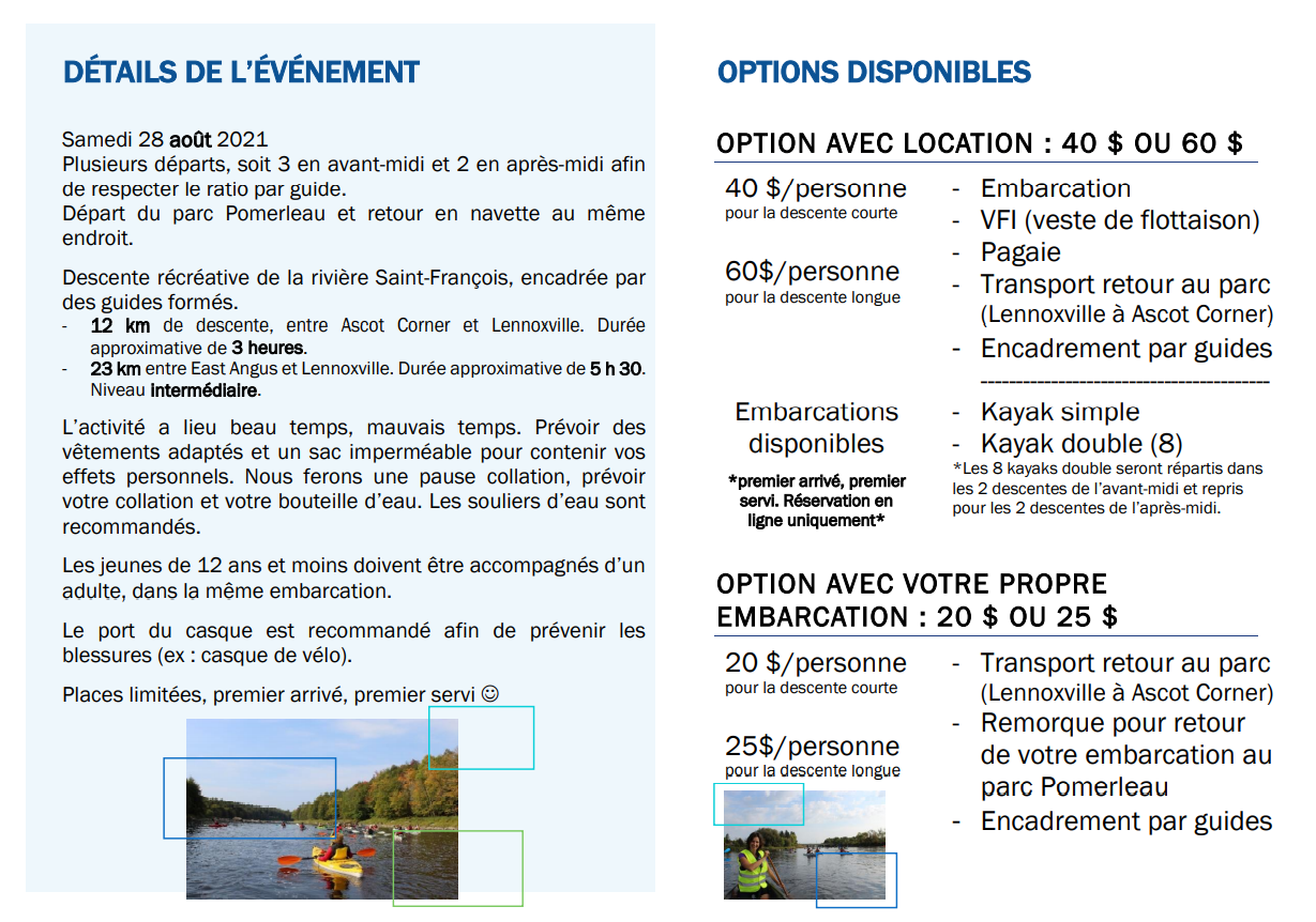 – Pagaie – Transport retour au parc (Lennoxville à Ascot Corner) – Encadrement par guides —————————————– |