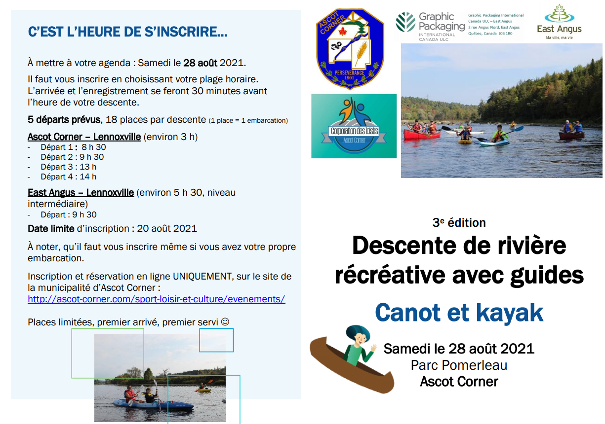 Pour une 3e année, la municipalité d’Ascot Corner, en collaboration avec la corporation des loisirs, organise une descente de rivière récréative, entre Ascot Corner et Lennoxville.