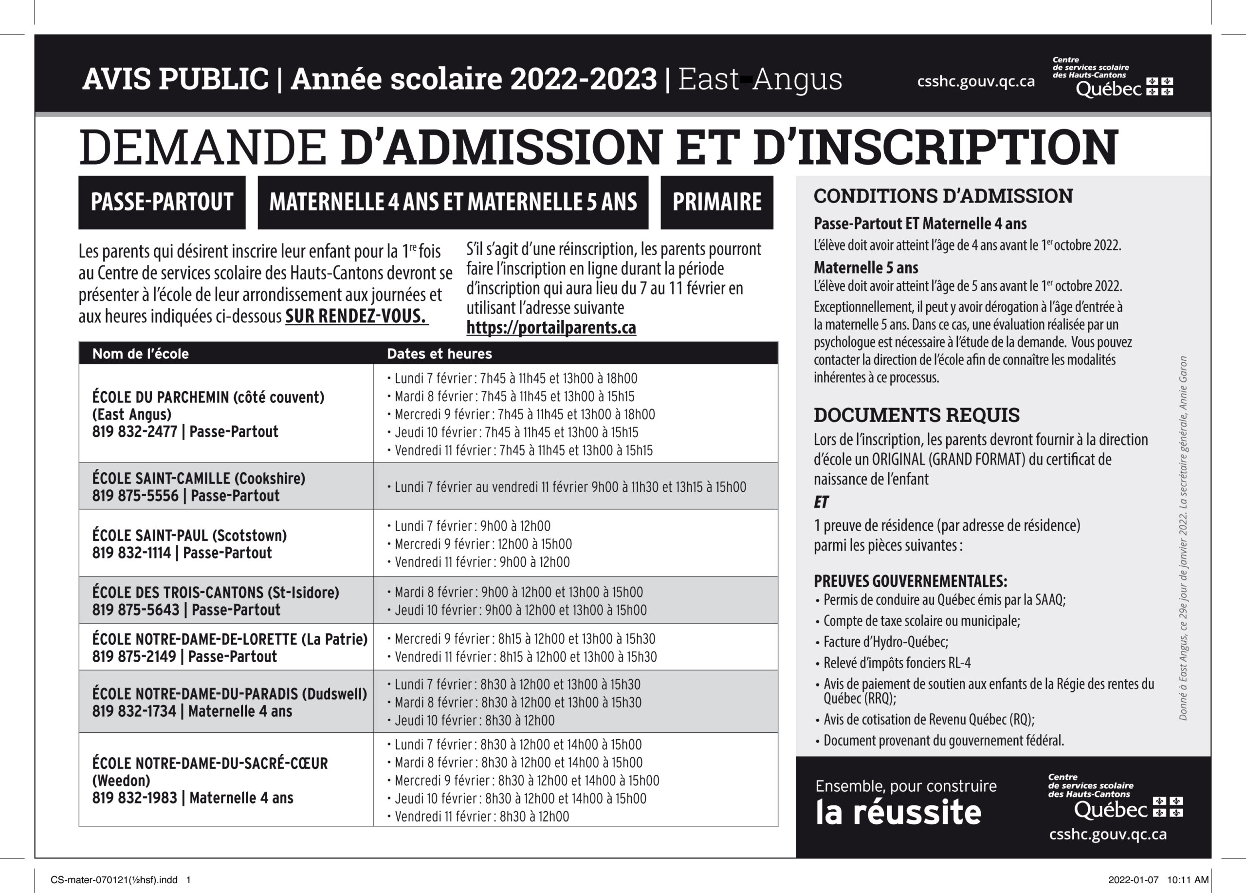 La période d’inscription au Centre de services scolaire des Hauts-Cantons se tiendra du 7 au 11 février prochain!