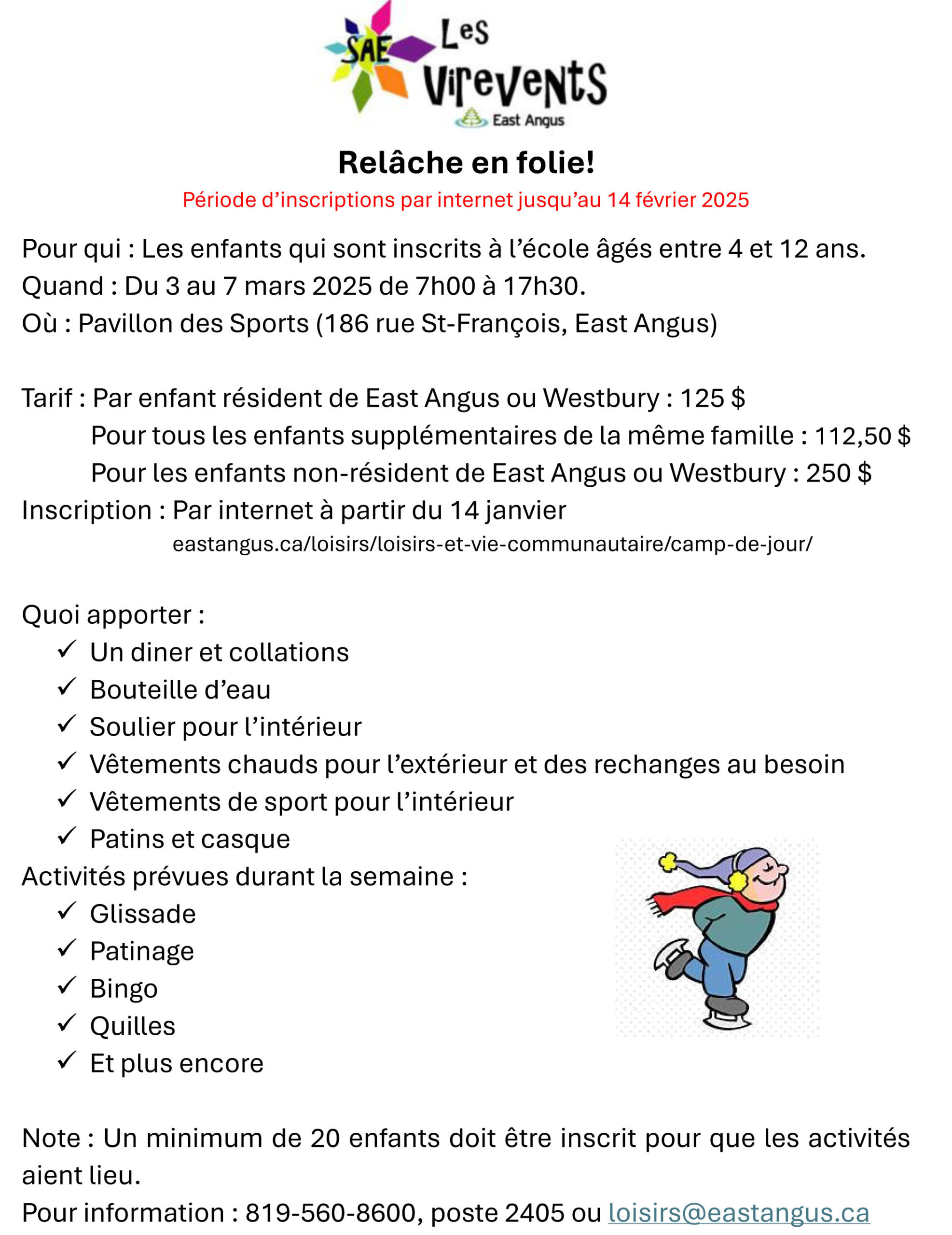 Coût (résidants de East Angus/Westbury) : 50$ par enfant