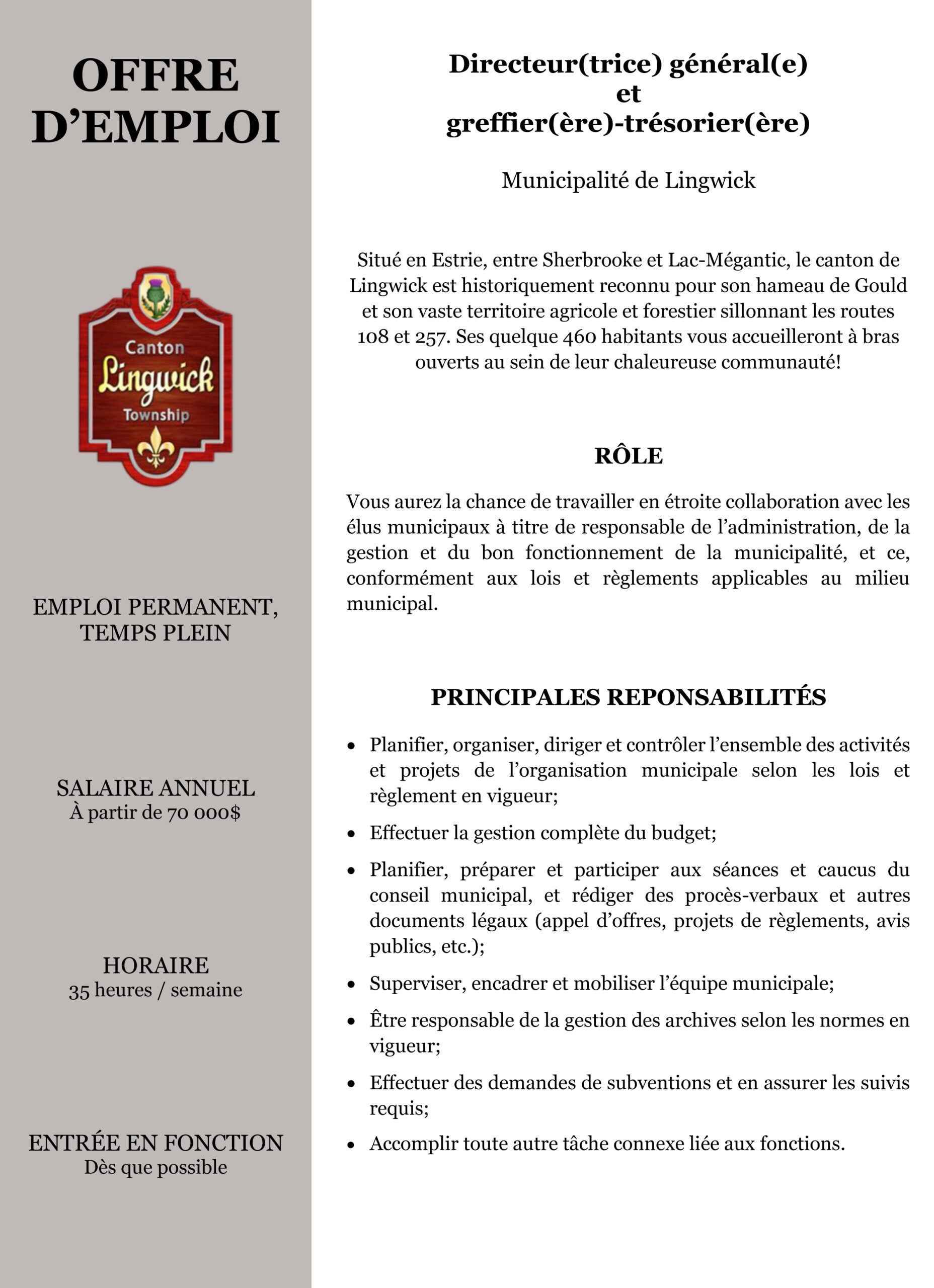Offre d’emploi – Direction du Canton de Lingwick Agrandir l'image Dans un souci d’aide de nos partenaires municipaux de Lingwick, une offre d’emploi pour la direction du Canton de Lingwick. East Angus2024-07-25T07:56:24-04:0025 juillet 2024|Nouvelles| Partager sur les réseaux FacebookTwitterCourriel